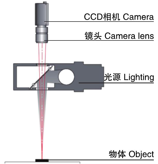 The CCD camera is placed on the reflected lighting outlet of the coaxial light, so that the reflected light is coaxial with the CCD camera to capture the characteristics of the object.